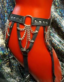 Leather belt with front and back adjustable buckles; leather straps with lots of chain. Sizes Sm/Med and L/XL.
