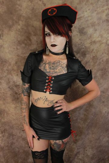 Low waistband, short skirt with laced front panels; side zipper. Sizes XS-XL; XXL (add $10.00) LR-SKRT-572