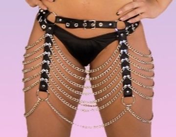 Leather and chain belt with 6 garter straps; adjustable front buckle. Size based on waist size. LR-GB-376