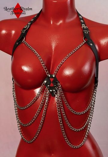 Leather bra with adjustable buckled halter neck strap and back; solid front. Two chains drapes under each cup. Cup sizes A-D. LR-BRA-234