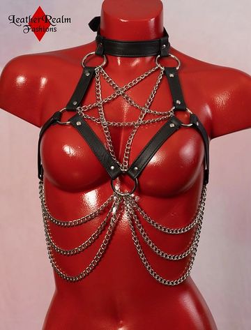Leather & chain cupless halter, adjustable buckles in back and on choker, with an inverted pentagram of chain. Sizes SM/MED and L/XL. LR-HAL-272