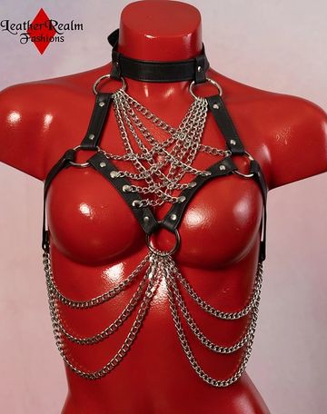 Cupless halter with a leather choker with three straps and several drapes of chain between them. Sizes SM/MED and L/XL. LR-HAL-275